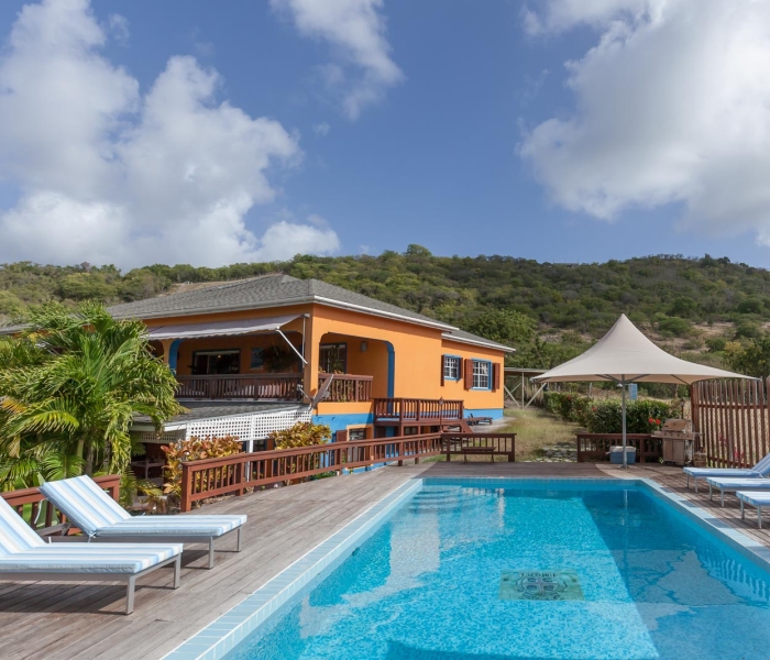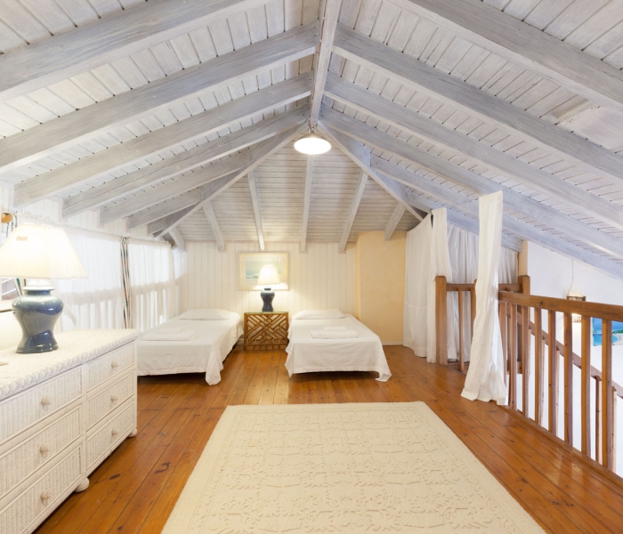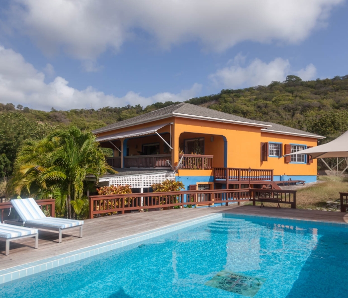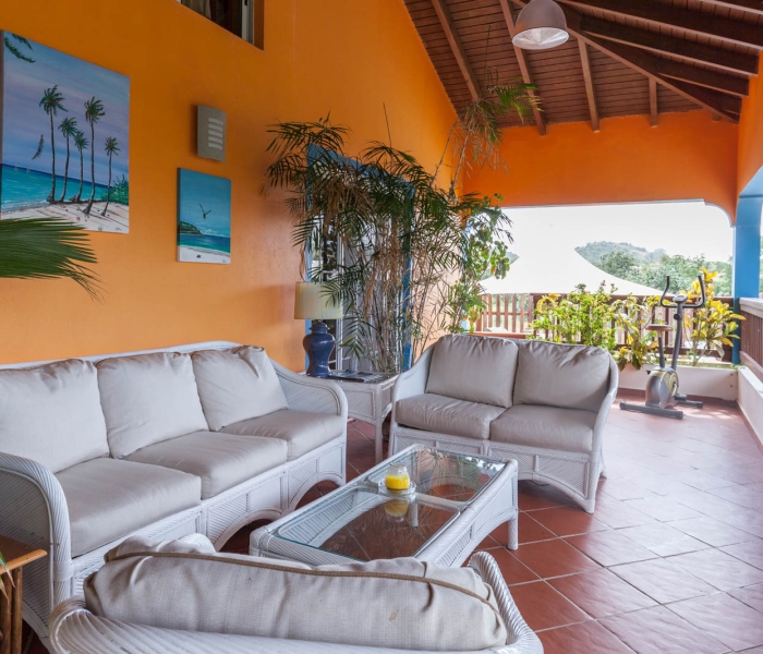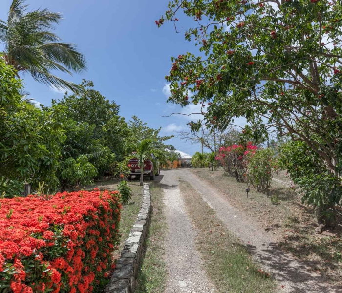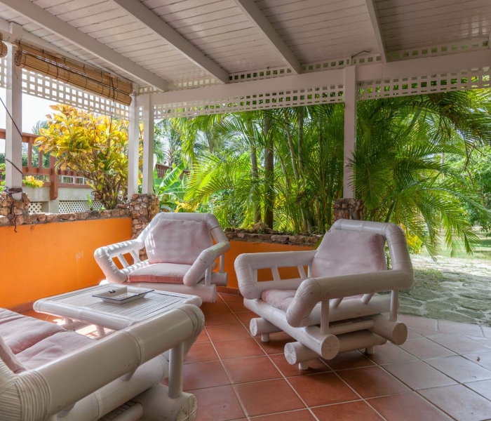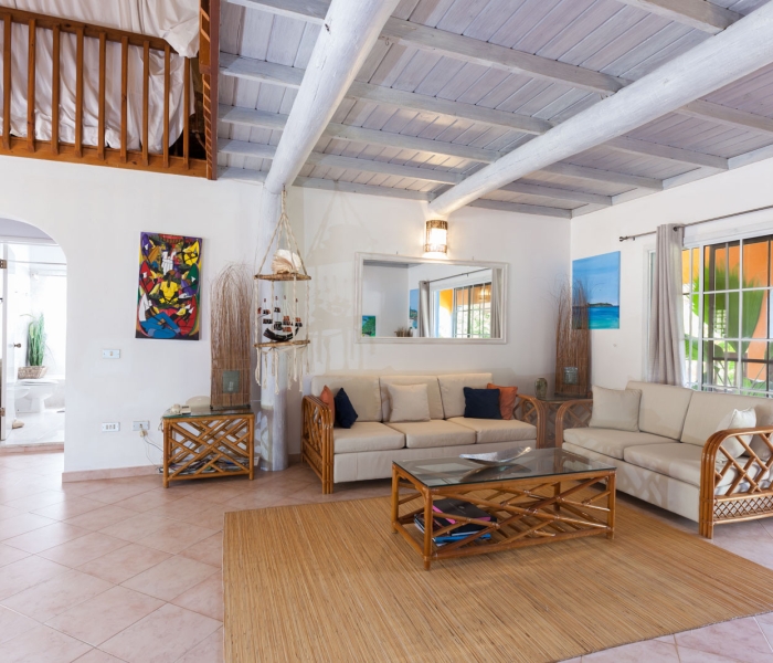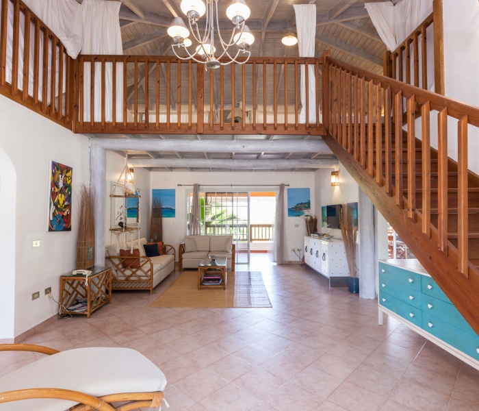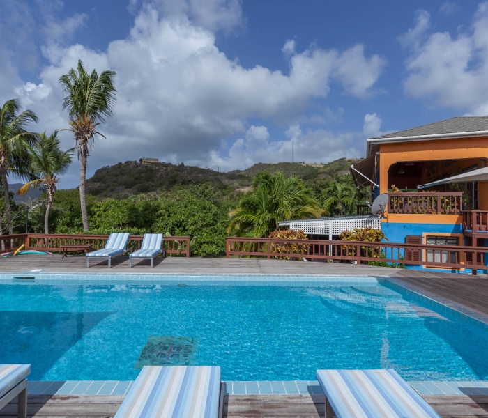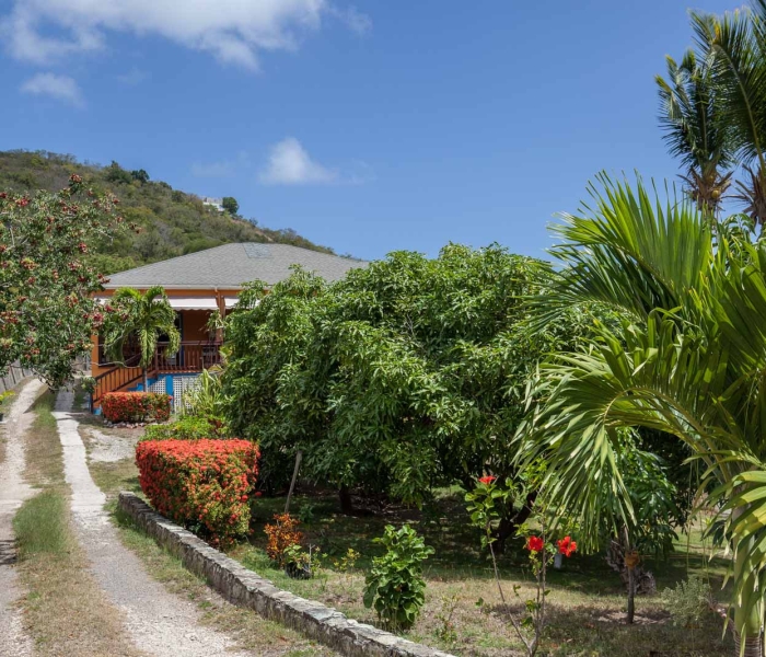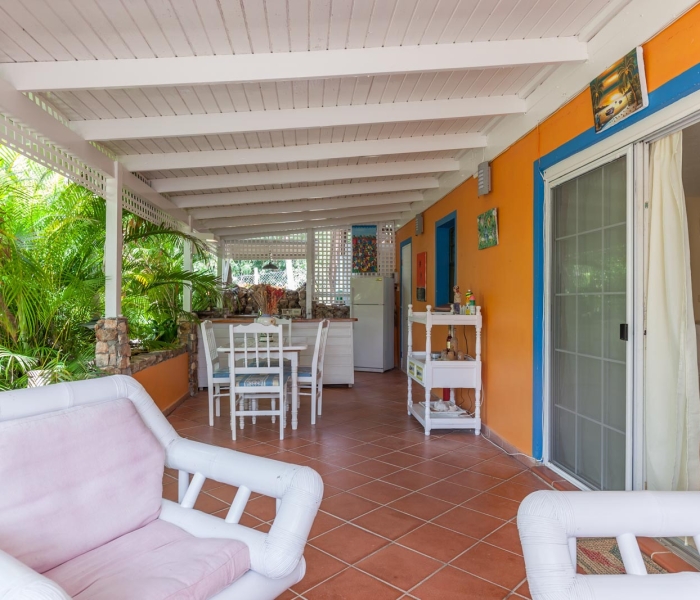Typical Caribbean style home for sale located at Piccadilly, a tranquil location on the southeast coast of the island of Antigua, at about five minutes driving from English Harbour, Shirley Heights, and the beautiful beaches of Galleon, Pigeon and Rendezvous. The villa is surrounded by a lavish tropical garden, filled with fruits trees such as Guava, Mango, Avocado, Orange, Papaya, Coconut and colorful flowers. The villa offers an intimate, secluded and relaxing atmosphere. The main floor of the villa houses living room, kitchen, veranda with dining table and lounge areas, three bedrooms and two bathrooms. On the above level is situated the loft, with single beds. The lower level of the villa houses a private apartment that includes the forth bedroom with private bathroom, small veranda, and outdoor kitchenette; this room has its own entrance. A few steps from the villa is located a large swimming pool, pool deck with dining area and BBQ.